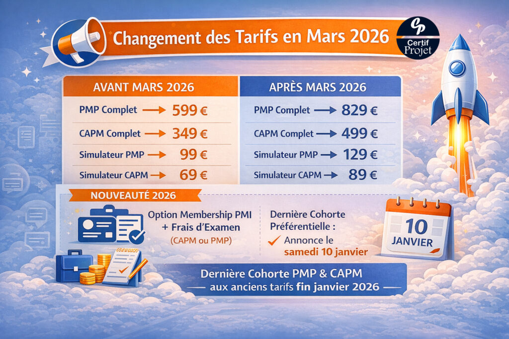 Bonne nouvelle : les anciens tarifs sont exceptionnellement maintenus jusqu’à fin mars 2026. À partir de début avril, les nouveaux tarifs entreront en vigueur. Simulateur PMP : 99 € → 129 € & Simulateur CAPM : 69 € → 89 €. Une excellente opportunité pour maximiser vos chances de réussite avant l’évolution des tarifs.